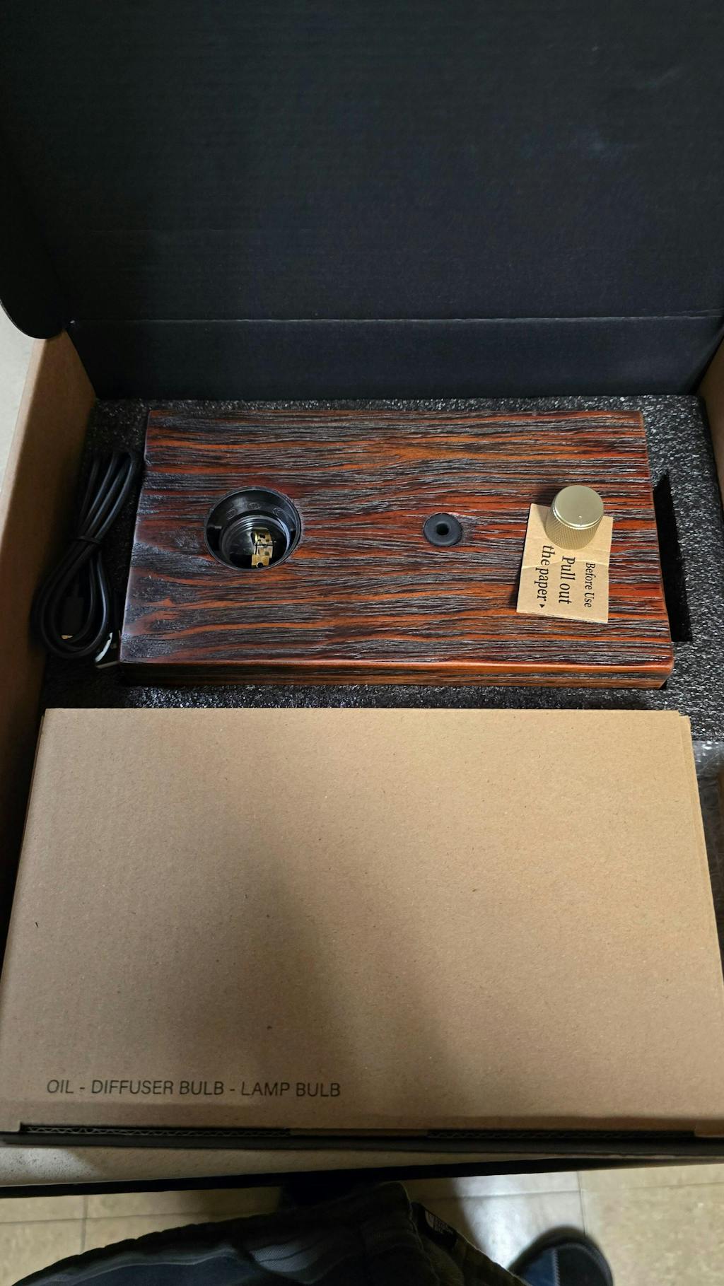 Base do Difusor, Frasco de Aroma, Lâmpada (opcional), Cabo de Alimentação USB e 30ml/1 Fl Oz de Óleo Essencial como bónus adicional.